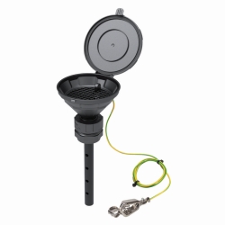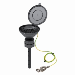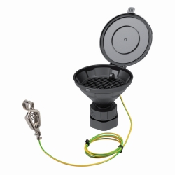 - Sicherheitstrichter in schwarz sind aus ableitfähigem HDPE und haben einen Erdungsanschluss zur Vermeidung von Zündgefahren. Erdungskabel (1,5 m) und Anschlussklemme sind im Lieferumfang enthalten