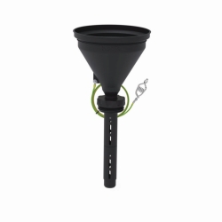 Schwarz. Trichter, mit herausnehmbaren Sieb, Spritzschutz und integriertem Kugelventil, zur Entsorgung von flüssigen Abfällen. Die Trichter werden mit montiertem Erdungskabel (Länge 1,5 m) geliefert. Optional mit zwei aufsteckbaren Füllrohren (Ø 36 mm und jeweils 97 mm Nutzlänge) erhältlich.
