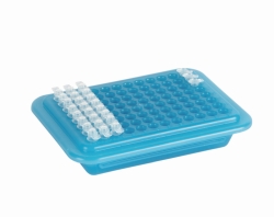 PCR-Cooler aus PP mit Deckel aus PC. Eisfreies Kühlsystem zur Vorbereitung und Lagerung von PCR-Röhrchen und -Streifen mit 0,2 und 0,5 ml sowie 96-Well-Platten in Standard- und Low-Well-Form. Die Probentemperatur wird ohne Deckel bis zu 3 Stunden bei unter 5 °C gehalten. 96-Well-Platten können über 1 Stunde bei einer Temperatur von 0 °C gekühlt werden. Überschreitung der Temperaturgrenze von 6 °C wird durch einen Farbwechsel des Coolers oder der einzelnen Wells angezeigt.